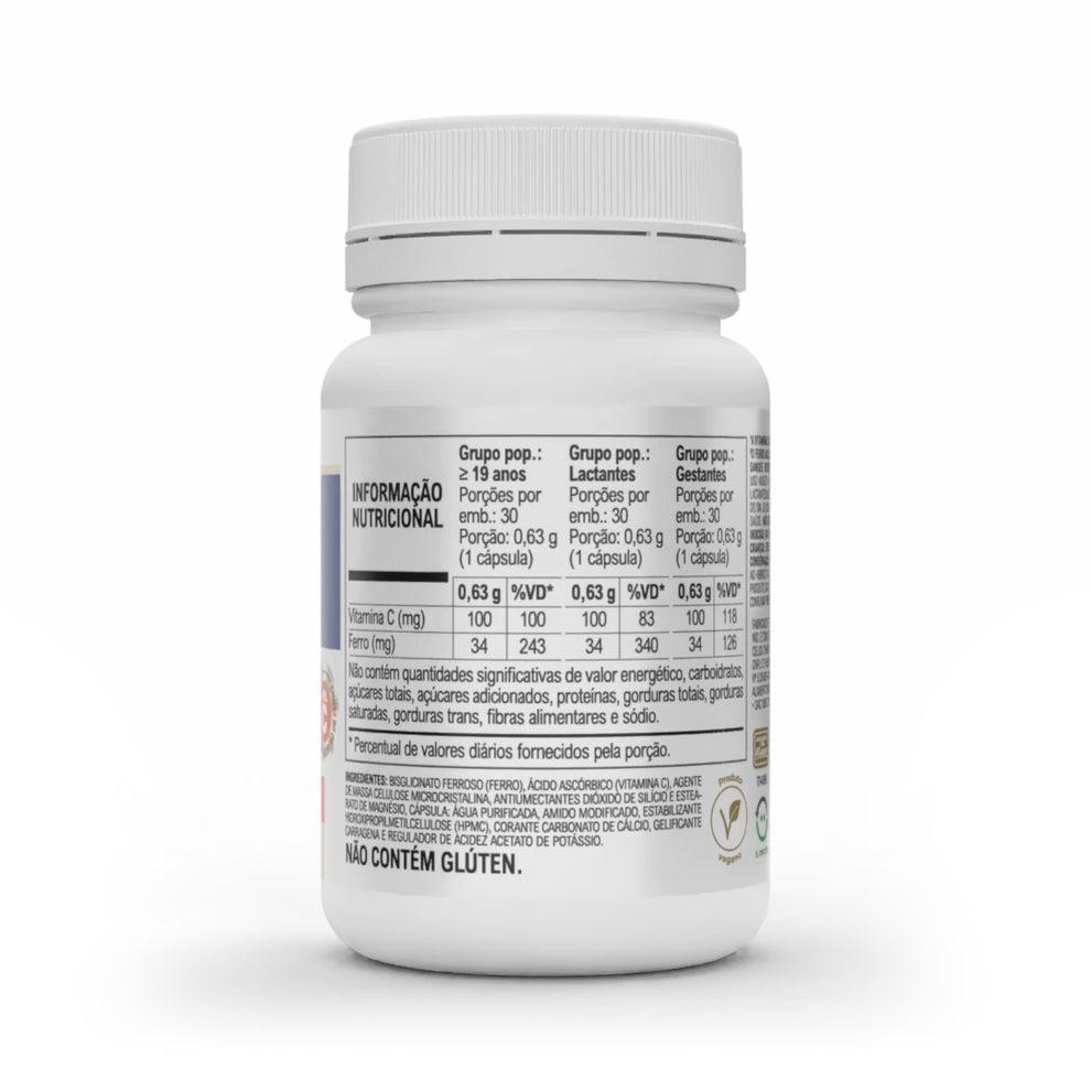 Ferro Plus é um suplemento alimentar em cápsulas que combina ferro quelato (bisglicinato ferroso) com vitamina C, garantindo maior biodisponibilidade e absorção.